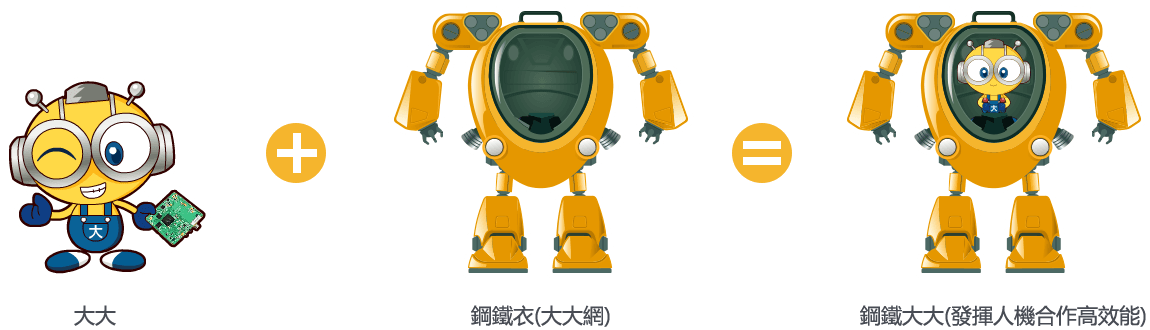 當工業4.0著眼於機器人,大聯大秉持永不放棄人的精神,思考代表工業3.5數位價值的鋼鐵人,將大聯大吉祥物代表『大大』放在鋼鐵人的心中,代表要善用大大的腦及心,鋼鐵人的四肢僅是提供平台及工具,當大大穿上鋼鐵衣,鋼鐵大大就能盡情發揮工作效能。透過人與智慧機械的合作,強化人的機能與效率,能提高未來工業4.0的進入成本及競爭門檻,以此打造大聯大芯通路。