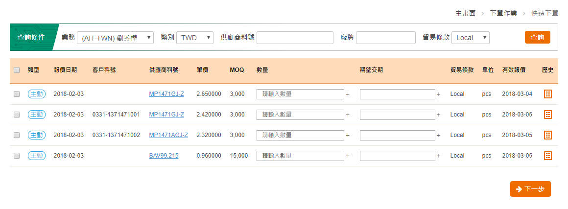 只需簡單勾選料號並輸入交期、數量等訊息,即可依所填資料,安心等待貨品送達,且能更即時得知其出貨狀況