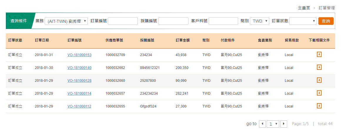輸入業務名稱、訂單或採購編號、幣別等條件,即可查詢訂單並下載相關文件