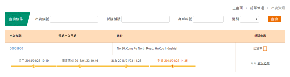 輸入出貨或採購編號、幣別、訂單狀態等條件,即可一覽到貨進度並下載出貨單